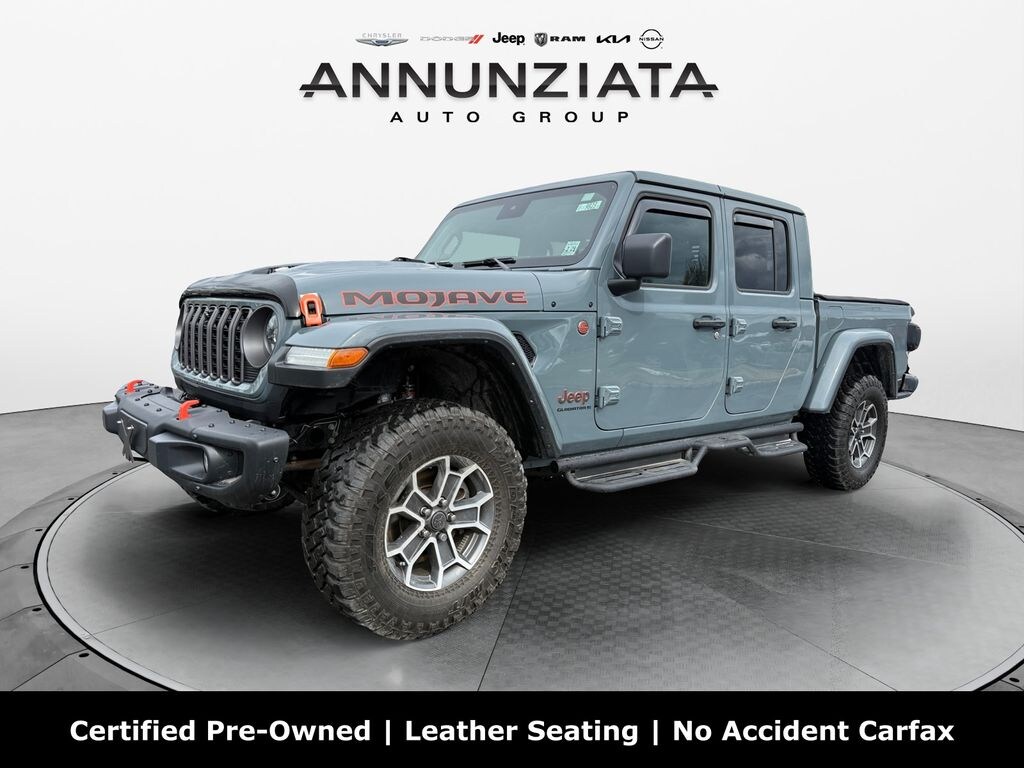 Any car. From any of our locations. Brought to the dealership that's most convenient for you. The Annunziata Auto Group - located in Orange County, New York, just minutes from Pennsylvania and New Jersey! Cargo Group w/Trail Rail System (Exterior 115V AC Outlet, Lockable Rear Underseat Storage, Roll-Up Tonneau Cover, and Trail Rails), Quick Order Package 24A Mojave X (12.3" Touchscreen Display, 4G LTE Wi-Fi Hot Spot, Alexa Built-In, Apple CarPlay, Connectivity - US/Canada, Google Android Auto, Integrated Center Stack Radio, SiriusXM Radio Service, SiriusXM w/360L, and USB Host Flip), FCA US LLC Certified Pre-Owned Certified, 4-Wheel Disc Brakes, 4.10 Rear Axle Ratio, 8 Speakers, 97 MPH Vehicle Max Speed Calibration, ABS brakes, Air Conditioning, Alloy wheels, AM/FM radio: SiriusXM with 360L, Apple CarPlay/Android Auto, Automatic temperature control, Brake assist, Compass, Delay-off headlights, Driver door bin, Driver vanity mirror, Dual front impact airbags, Dual front side impact airbags, Electronic Stability Control, Emergency communication system: Jeep Connect, Front anti-roll bar, Front Bucket Seats, Front Center Armrest w/Storage, Front dual zone A/C, Front fog lights, Front reading lights, Fully automatic headlights, Heated door mirrors, Heavy Duty Suspension w/Gas Shocks, Illuminated entry, Integrated roll-over protection, Jeep Trail Rated Kit, Leather steering wheel, Low tire pressure warning, MOPAR All-Weather Slush Mats, MOPAR Doors Off Mirror Kit, MOPAR Spray In Bedliner, Occupant sensing airbag, Outside temperature display, Overhead airbag, Panic alarm, Passenger door bin, Passenger vanity mirror, Power door mirrors, Power steering, Power windows, Premium Cloth Seats w/Sport Bolsters, Radio data system, Radio: Uconnect 5 w/12.3" Display, Rear anti-roll bar, Rear reading lights, Remote keyless entry, Security system, Speed control, Split folding rear seat, Steering wheel mounted audio controls, Tachometer, Telescoping steering wheel, Tilt steering wheel, Traction control, Trip computer, Variably intermittent wipers, Voltmeter, Wheels: 17" x 7.5" Dark Gray Painted, and Wheels: 17" x 7.5" Machined/Painted Dark Gray.